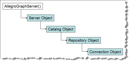 In example1() we build a chain of Python objects, ending in a"connection" object that lets us manipulate triples in a specific repository. The overall process of generating the connection object follows this diagram: