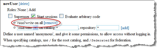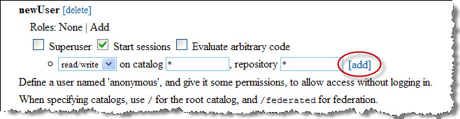 It is imporant that you set up access permissions for the new user. Use the form to create an access rule by selecting read, write or read/write access, naming a catalog (or * for all), and naming a repository within that catalog (or * for all). Click the [add] link. This creates an access rule for your new user. The access rule will appear in the permissions display: