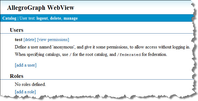 The first page of WebView is a summary of your catalogs, repositories, and federations. Click the user account link in the lower left corner of the page. This exposes the Users and Roles page.